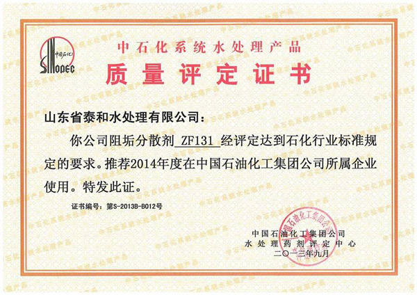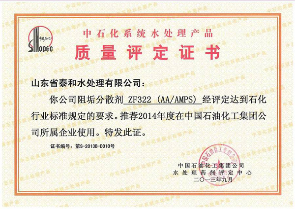 中石化系統水處理產品質量評定證書